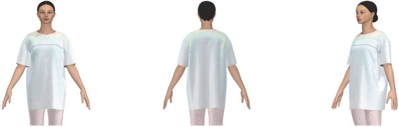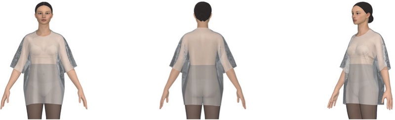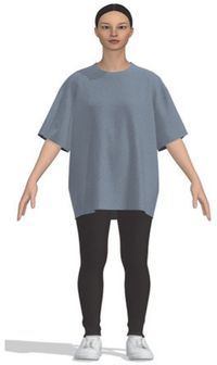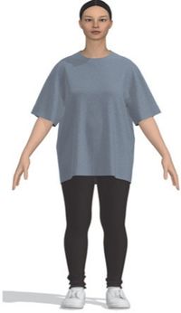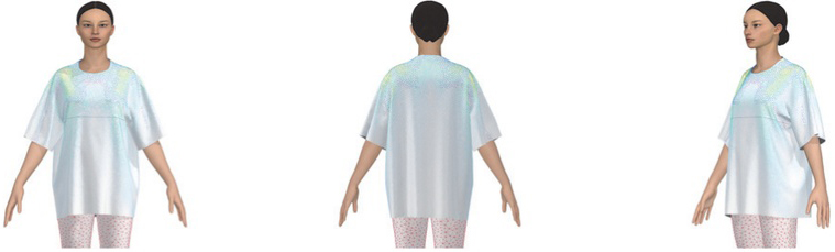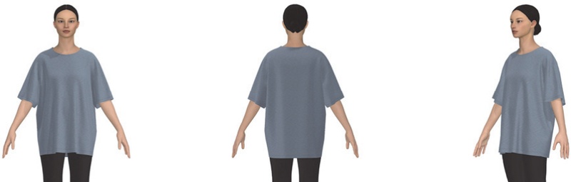 본 연구를 위해 티셔츠에 적용한 디지털 소재는 저지(물성: Polyester 65%, Cotton 20%, Viscose rayon 10%, Spandex/Elastane 5%, 두께: 0.83 mm, 무게: 252 gsm, 패턴: solid)(PD-00306117, n.d.)이다. 선행연구(Kwak et al. 2016)를 참고하여, 소재 물성을 선정하였고, 20대 여성이 주요 소비층인 오버사이즈 티셔츠 소재를 검색한 후 적절한 디지털 소재를 선정하였다.