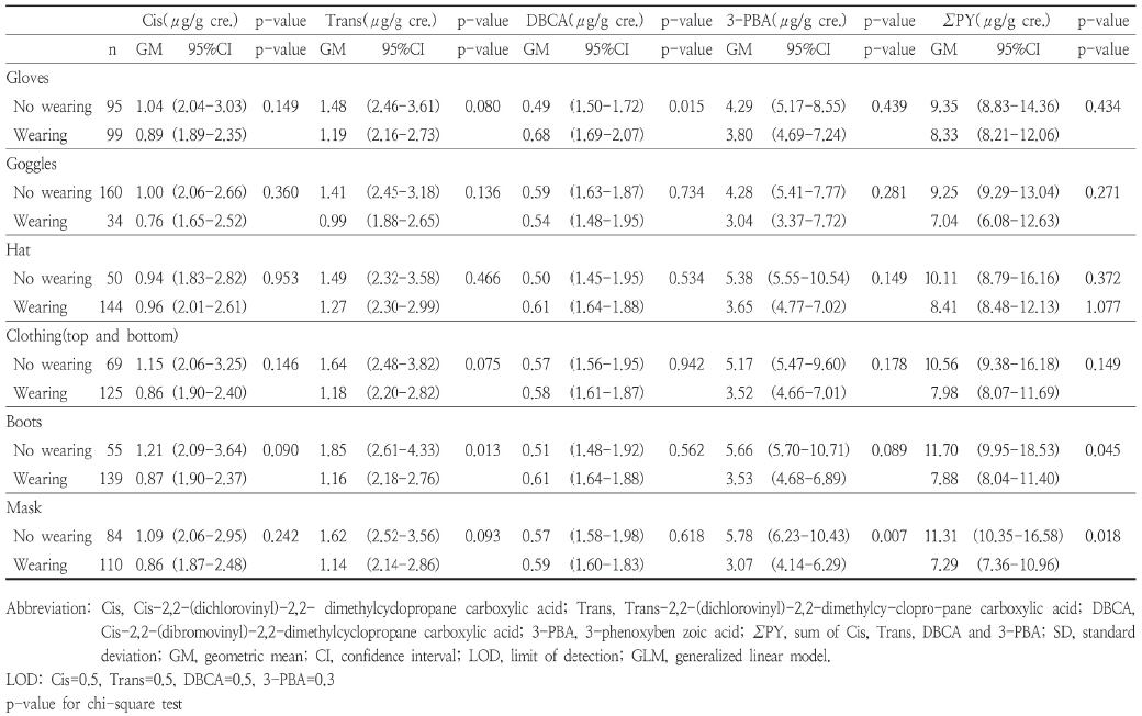 보호구 각각에 대한 착용 습관에 따른 소변의 피레스로이드계 검출률은 보호구를 착용한다고 응답한 집단이 보호구를 착용하지 않는다고 응답한 집단 보다 Cis-DCCA, Trans-DCCA, DBCA, 3-PBA 모두 낮게 검출 되었다. 자세히 살펴보면, 보호장화를 착용하였을 경우 착용하지 않았을 때 보다 모두 낮은 검출률을 보였으며, DBCA만 제외하고 통계적으로 유의하였다(p<0.01). 방제복 착용의 경우 Trans-DCCA, 3-PBA, ∑PY에서 검출률이 더 낮은 편이었으며, 농약살포용 장갑, 보호모자, 보호마스크에서는 Cis-DCCA, Trans-DCCA에서 검출률이 유의하게 낮았다(p<0.05)(Table 4).