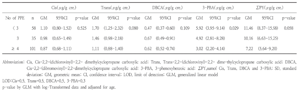 연령을 보정한 상태에서 보호구의 착용 개수가 많아질수록 본 연구대상자에서 피레스로이드계 대사물질의 DBCA만 제외하고 노출수준은 모두 낮은 편이었다. 특히 4가지 이상의 보호구를 착용했을 경우 3-PBA에서 유의하게 낮았다(p=0.029).