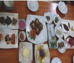 음식점3은 지정 업소 중 경관이 가장 우수한 조건들을 갖추고 있는 장점이 있었다. 메뉴는 시골밥상으로 축령산 일대에서 직접 채취하거나 재배한 식재료를 이용하여 정성껏 준비한 메뉴들로 구성되었다(Table 2). 재료의 신선도가 뛰어나다는 장점을 가지고 있었다. 하지만 전체적으로 동일한 조리법으로 식상함이 있으며 조미료의 맛이 강한 것이 단점이다. 메뉴 진단평가결과 대중적인 맛과 구성이지만 숙채류의 과다 사용으로 인해 각 메뉴별로 차별성이 부족했다(Table 3). 메뉴구성 현황에서 숙채류는 69.24% (Table 4)로 과다하게 사용하고 있었다. 시골밥상을 지향하는 상차림 이지만 한 종류의 메뉴를 집중적으로 사용하여 메뉴의 다양성과 독창성이 부족한 상차림 이였다. 신선한 재료를 이용하여 다양한 조리법을 이용한 메뉴 개발이 절실히 필요하였다.