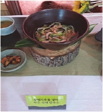 연구자 본인이 수행한 축령산 치유마을 협의회 메뉴개발 의견에서 면류 메뉴개발 필요성에 대한 인식이 있었다(Mt. Chungnyeong Healing Village Council 2015). Park et al.(2016)의 연구 결과에서도 도시지역 성인들이 면 중심의 한식(12%)도 선호하고 있어 축령산 지역 주민들의 의견과 많은 부분이 일치하였다. 또한 지역성 및 식재료를 중요시 생각하였고 지역특산식품과 제철식재료를 사용하여 지역 고유 조리법을 활용한 전통성이 있는 메뉴 개발이 필요하다는 연구 결과도 많은 부분 일치하였다.(Park 2016). 이러한 점을 반영하여 지역 특산품인 삼채를 이용하여 삼채 칼국수를 이용한 면상을 일품요리로 개발하였다(Table 5).