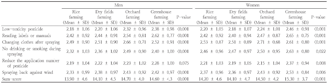 농업인들이 농약 살포시 인체에 미치는 피해를 예방하기 위해 어느 정도나 노력하고 있는 지를 살펴보면(Table 3), 대부분의 항목에서 대체로 노력하고 있는 것으로 나타났으며 이는 Oh et al.(2014)의 기존 선행연구와 유사하다. 남자에서는 ‘농약 살포 횟수 감소’를 제외하고 모두 작목별 간에 차이가 있었고, 여자의 경우는 모든 항목에서 작목별 차이가 있었다. 남자의 경우 ‘인체 독성이 적은 농약 사용’, 설명서에 따른 사용법과 용량 지키기’, ‘농약 살포 횟수 감소’의 노력 점수가 하우스에서 높았으며, ‘농약 사용 후 입은 옷 교체’, ‘농약 살포시 금주 및 금연’, ‘농약 살포시 바람을 등지기’ 노력 점수의 경우는 과수원에서 높았다. 여자는 과수원에서 ‘농약 사용 후 입은 옷 교체’ 노력을 제외한 모든 항목이 하우스에서 높았다. 각 항목의 노력 합계 점수 또한 남녀 모두 과수원과 하우스에서 비교적 높은데 이는 과수원과 하우스가 비교적 젊은 농업인이 많으면서(표 제시하지 않음), 타작목에 비해 적기에 병충해를 방제하지 않으면 수확량 감소와 상품성이 떨어져 Table 2의 결과와 같이 많은 횟수의 농약 살포를 통한 농약의 위험성을 인지하고 중독을 예방하려는 노력이 고령자가 많은 논농사나 밭농사에 비해 높은 것으로 생각된다. 따라서 고령자가 많이 분포 되어 있는 논농사와 밭농사를 하는 농업인을 대상으로 농약 살포시 중독 노출 저감 관리에 대한 인식함양이 필요한 것으로 생각된다.