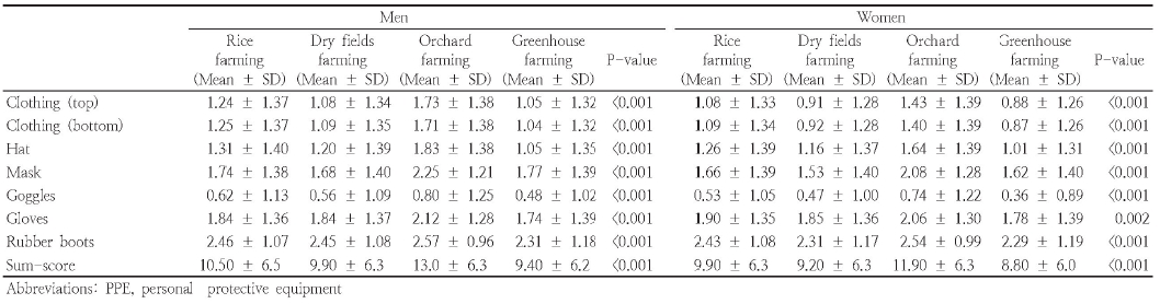작목별 보호구 착용(Table 4)은 남녀 모두 작목별로 보호구 착용 점수에 차이가 있었다. 보호 장화의 경우 모든 작목에서 가장 높은 착용 점수를 보였으며, 거의 모든 작목에서 장갑, 마스크, 모자, 방제복, 보안경의 순으로 착용 점수가 낮아졌다. Lee et al.(2016)의 연구에서도 보호 장화에서 높은 착용률을 보여 줬으며, 가장 낮은 보호구 착용은 보안경이었다. 방제복의 상ㆍ하의의 경우 남자에 비해 여자가 낮은 착용 점수를 보이고 있는데, 농약 살포시 여자는 남자에 비해 주로 보조적인 역할을 담당하는 경우가 많기 때문에 방제복 착용에 대한 인식이 부족한 것으로 생각된다. 또한 남녀 모두 다른 보호구에 비해 비교적 방제복 착용 점수가 낮은 것은 You(2006)의 연구결과와 같이 농약 중독에 대한 심각성을 인지하지 못하거나 착용 시의 스트레스에 의한 것으로 생각된다. 각 작목별 보호구 착용의 합계 점수는 남녀 모두 과수원에서 높았는데 이는 과수 농가의 특성상 비교적 젊은 농업인이며 타 작목에 비해 장시간의 농약살포와 많은 살포 횟수에 의해 농약의 위험성에 대한 인지 정도가 높아 농약 중독 예방 노력과 같이 보호구 착용도 잘 이뤄지는 것으로 생각된다. 반면에 하우스의 경우는 가장 낮은 보호구 착용 점수를 보여 주고 있는데 이는 밀폐된 공간과 고온으로 인해 보호구 착용을 기피하는 성향이 있는 것으로 보이며, 이에 따른 보호구 착용에 대한 교육이 필요하다.