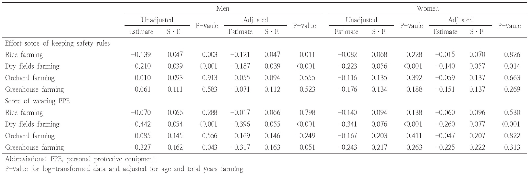 작목별 농약 중독 예방 노력과 보호구 착용에 대한 농약 노출량과의 관계를 보기 위해 각 중독 예방 노력 및 보호구 착용 점수를 종속변수로 하고 농약 안전관리 수준에 영향을 줄 수 있는 학력, 흡연, 음주 등 일반적 특성 및 건강행태에 대한 조사가 되지 못하였지만 농약 노출과 관련이 있는 연령과 농업 종사기간을 고려한 다중 회귀분석으로 검증한 결과는 다음과 같았다(Table 5). 남자에서는 농약 노출량이 많을수록 논농사(β=-0.121, p=0.011)와 밭농사(β=-0.187, p<0.001)에서 중독 예방 노력 점수가 낮아지는 것으로 나타났으며, 보호구 착용 점수의 경우는 밭농사(β=-0.396, p<0.001)에서 낮아졌다. 여자의 경우도 밭농사에서 중독 예방 노력 점수(β=-0.140, p=0.014)와 보호구 착용 점수(β=-0.260, p<0.001)가 낮아 졌다. 논의 경우 농약을 직접 살포 하는 남자들이 년간 살포하는 횟수가 다른 작목에 비해 현저히 적고, 밭의 경우는 주로 고령자가 많은 비중(표 제시하지 않음)을 차지는 작목 특성과 비교적 소작을 하지만 년간 많은 살포 횟수와 하루에 살포하는 시간이 길어 농약 중독 예방 노력과 보호구 착용에 소홀해지는 것으로 보인다. 또한 전반적으로 모든 작목에서 통계적으로 유의하진 않았지만 농약 노출량 증가에 따라 농약 중독에 대한 예방 노력과 보호구 착용 수준이 낮아지는 현황을 보여 주고 있다. 이는 아직 까지 농약 노출의 유해성에 대한 심각성을 농업인들이 제대로 인지하고 있지 않음을 보여주고 있다.