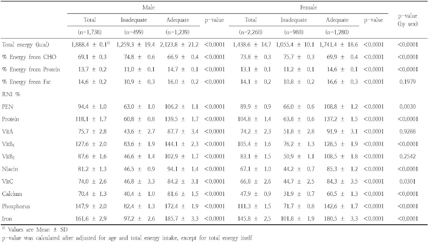 남성, 여성 모두 에너지 필요 추정량에 비해 섭취량이 낮았으며, 권장량 이상으로 섭취한 영양소는 단백질, 티아민, 인, 철이었으며, 비타민A, 리보플라빈, 니아신, 비타민C, 칼슘은 권장량 미만으로 섭취하고 있었다. 남녀 모두 단백질섭취가 부족한 군이 충분히 섭취하는 군에 비해 모든 영양소의 %KRNI가 낮았다. 생선, 가금류 등 양질의 단백질 섭취가 영양불량의 위험을 낮춘다는 서구의 연구결과(Ribeiro et al. 2011)와 마찬가지로, 단백질의 섭취가 부족한 경우 다른 영양소 역시 필요량 미만으로 섭취하고 있는 본 연구의 결과는 단백질 단일 영양소의 부족이 전반적인 식품섭취의 부족과 연결되어 있음을 추정 가능케 한다.