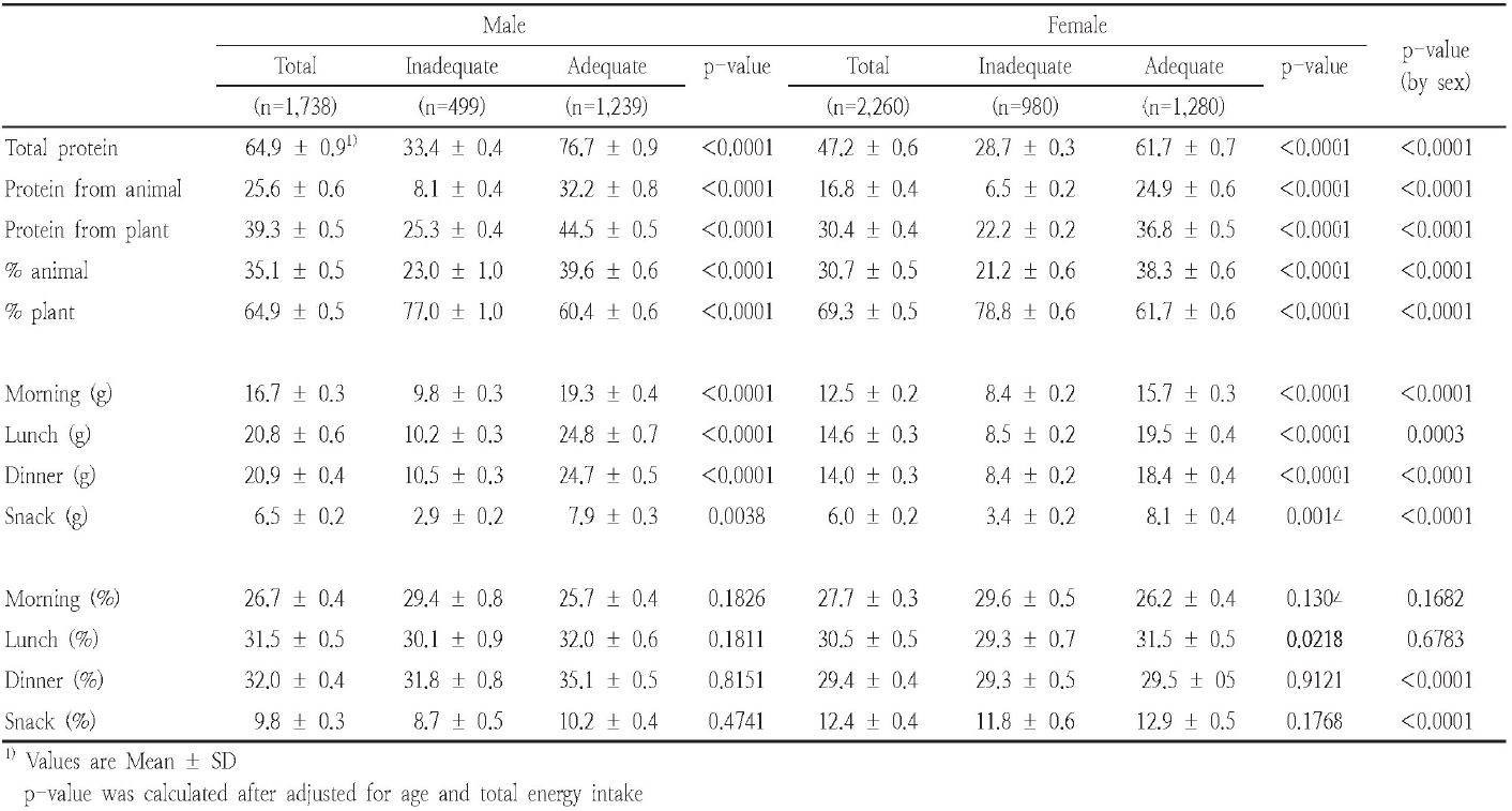 급원별 단백질 섭취량을 비교한 결과, 남성과 여성 모두 동물성 단백질(남성 35.1%, 여성 21.2%)에 비해 식물성 단백질(남성 64.9%, 여성 78.8%)의 섭취비율이 높았다. 서구에서는 동물성 급원의 단백질섭취가 60-70%를 차지하는 데에 비해(Houston et al. 2008) 우리나라는 높은 식물성 급원 위주의 단백질 섭취가 나타나는 이유는 한국 노인의 식사패턴이 밥과 나물 등 채소 위주의 채식하는 식습관을 가지고 있고(Shin et al. 2016; Han & Yang 2018) 육류식품을 적게 섭취하는 것이 비만, 성인병을 예방하는 건강식이라는 인식이 있기 때문으로 추정된다(Han & Bae 1996).