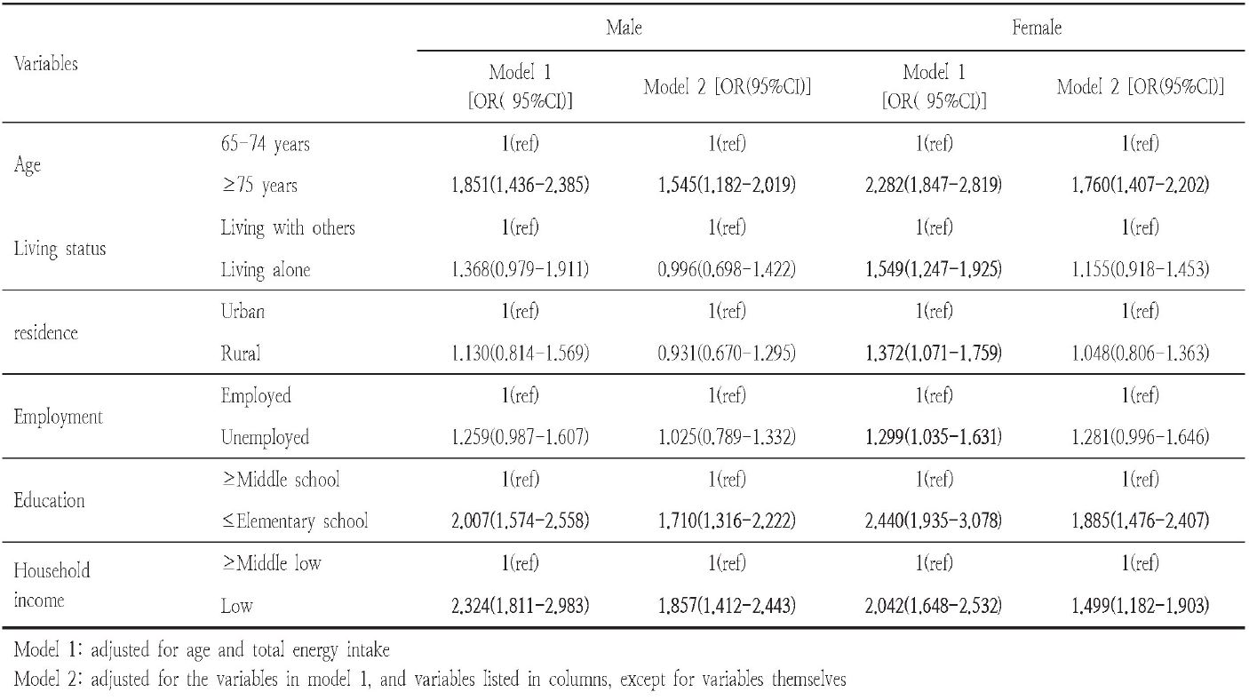 단백질 섭취에 영향을 주는 변수들의 로지스틱 회귀분석 결과는 Table 4에 나타내었다. 남녀 모두 나이가 단백질 섭취에 영향을 주는 요인으로 나타났다. 남성의 경우 75세 미만에 비해 75세 이상의 경우 1.9배(OR 1.851, 95% CI 1.436-2.385), 여성의 경우 2.3배(OR 2.282, 95% CI 1.847-2.819) 단백질 섭취 부족 위험이 높았다. 사회경제적요인과 단백질 섭취 부족의 위험에 대한 분석을 나이와 총 에너지 섭취량의 영향을 통제한 후 실시 하였을 때 남녀 모두 교육수준과 경제수준이 낮을수록 단백질 섭취 부족의 위험이 2배 이상 높은 것으로 나타났다. 초등학교 졸업 이하의 저학력일 경우 단백질 섭취 부족의 위험도가 남성 2.007배(95% CI 1.574-2.558), 여성 2.440배(95% CI 1.935-3.078)였으며 소득 4분위 중에서 ‘하’에 해당할 경우 그렇지 않은 경우에 비해 단백질 섭취부족 위험이 남성 2.324배(95% CI 1.811-2.983), 여성 2.042배(95% CI 1.648-2.532) 높았다. 이 같은 결과는 교육수준이 높아지면 소득수준이 향상되어 고품질의 식품구매력이 높아지며 더불어 균형있는 영양소의 섭취에 대한 지식을 가질 배경이 높기 때문으로 생각된다.