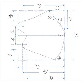 Table 2의 세부 측정 항목은 총 15항목으로, 각 항목명과 기호는 마스크 수직길이(Ⓐ), 코다트 길이(Ⓑ), 마스크 너비(Ⓒ:위), 마스크 너비(Ⓒ′:아래), 마스크 위 깊이(Ⓓ), 마스크 아래 깊이(Ⓔ), 코다트량(Ⓕ), 턱다트량(Ⓖ), 코길이-1(Ⓗ), 코길이-2(Ⓘ), 에어룸(Air room 너비(Ⓙ), ‘위 밴드폭(Ⓚ)’, ‘아래 밴드폭(Ⓛ)’, ‘위 밴드깊이(Ⓜ)’, ‘아래 밴드깊이(Ⓝ)’이다. 이 중 ‘코길이-1(Ⓗ)’은 마스크 상의 골선에 해당하는 직선길이를 뜻하며, ‘코길이-2(Ⓘ)’는 ‘코길이-1’의 연장선으로 마스크의 수직선과 맞닿는 점까지의 총길이를 의미한다. 그리고 ‘코길이-2’가 수직선에 닿은 지점인 수직선의 깊이가 ‘코다트 길이(Ⓑ)’이다. ‘에어룸 너비(Ⓙ)’는 피험자가 마스크를 착용한 후 윗입술과 아랫입술 사이의 닿는 위치를 마스크에 표시한 후 마스크가 평편한 상태에서 마스크의 수직선과의 수평거리를 측정한 것이다. 2D형 마스크의 경우 다른 마스크 디자인에 비해 에어룸이 넓어 입술이 마스크에 닿지 않고 호흡을 용이하게 해주어 쾌적한 환경을 만들기도 한다. 또 수직선에서 고무밴드까지를 수평거리를 측정한 ‘위 밴드폭(Ⓚ)’, ‘아래 밴드폭(Ⓛ)’이 있으며, 중심점(Pivot)을 기준으로 고무밴드 부착점까지의 깊이를 측정한 ‘위 밴드깊이(Ⓜ)’, ‘아래 밴드깊이(Ⓝ)’가 있다.
