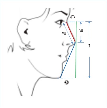 둘째, 마스크의 수평선은 ‘얼굴너비’와 ‘마스크너비1(위)’, ‘마스크너비2(아래)’가 사용되었다. 피타고라스 정리를 활용한 계산법에서 도출된 마스크 너비와 유사한 브랜드는 총 2개로 2D-2(11.2 cm), 2D-4(10.9 cm)이다. 외관평가에서 가장 만족도가 높았던 2D-2의 마스크의 너비는 11.2 cm로 광대뼈를 살짝 감싸는 정도가 얼굴이 작아 보이는 효과가 있었다. 따라서 마스크 너비1은 약 11∼11.8 cm, 마스크 너비2는 약 10∼10.6 cm 정도가 이상적이다.