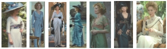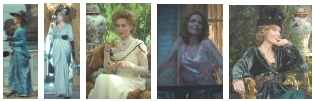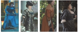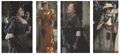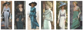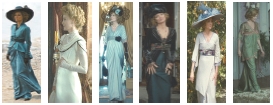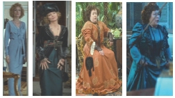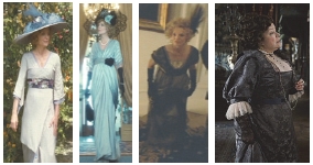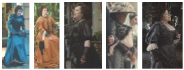 레아가 착용한 흐린 초록(cloudy green) 색 튜닉 스타일 드레스는 기모노 소매, 문양 등을 이용하여 벨 에포크 시대의 이국적인 취향을 나타내었다. 신혼여행에서 돌아온 셰리를 맞이하는 장면 Fig. 17에서, 샬롯이 착용한 탁한 파랑(cloudy blue) 색 실크 드레스는 퍼프(puff) 소매로 어깨가 약간 강조되면서 의상 전체에 길게 레이스 프릴장식과 허리를 가늘게 조인 스커트 속에 언더 스커트를 착용하며 스커트 폭이 넓은 아워글라스 스타일을 나타내었다. Fig. 18의 셰리 결혼식 후 모임에서 샬롯이 착용한 화려한 보석 장식의 검은색 실크 드레스는 깊게 파인 목 부분을 덮는 얇은 소재와 시폰 소매로 시스루(see-through) 효과를 내며 핑거리스 토시와 화려한 긴 목걸이로 장식적 효과를 더했다. Fig. 19의 셰리 결혼식에서, 샬롯은 여러 층의 프릴로 소매 부리를 장식한 벨 소매로 구성된 옅은 복숭아(pale peach) 색 드레스를 착용하였다. 그 위에 문양이 있는 검은(black) 색 레이스 소재의 볼레로 가디건(bolero cardigan)과 스커트를 이중으로 착용하여 비치는 효과를 나타내었다. 샬롯은 의상 외에도 꽃으로 전체를 장식한 메리 위도우 햇, 핑거리스 토시, 파우치 백 등 다양한 액세서리로 화려함을 더하였다.