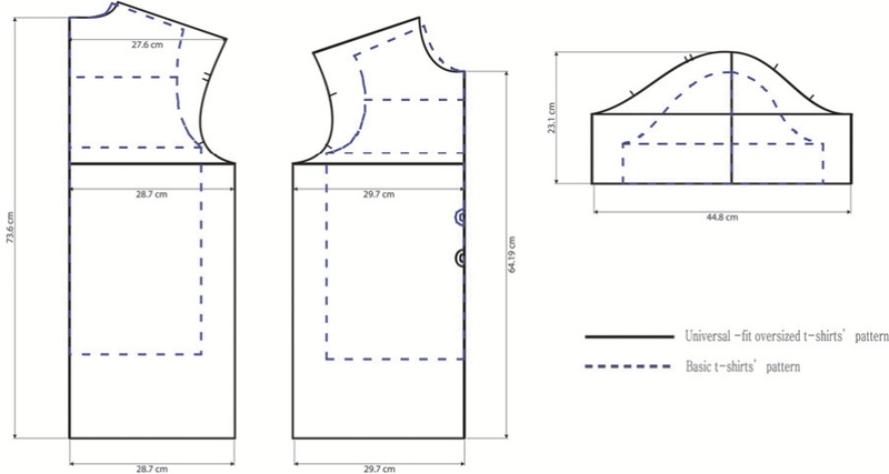 이 중 그룹 3 베이직 티셔츠는 패턴 제도 기준으로 활용되었으며, 그 치수는 상의길이 59.0 cm, 어깨너비 39.5 cm, 가슴너비 46.8 cm, 소매길이 19.6 cm였다. 그룹 6의 오버사이즈 티셔츠는 상의길이 73.6 cm, 어깨너비 55.2 cm, 가슴너비 58.4 cm, 소매길이 23.2 cm로 나타났다. 그룹 5 또한 오버사이즈 티셔츠(상의길이 72.0 cm, 어깨너비 58.0 cm, 가슴너비 59.3 cm, 소매길이 40.8 cm)에 해당하였으나, 해당 그룹의 제품 수가 적어 본 연구에서는 제외하였다.