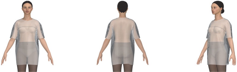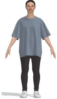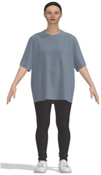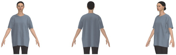 본 연구를 위해 티셔츠에 적용한 디지털 소재는 저지(물성: Polyester 65%, Cotton 20%, Viscose rayon 10%, Spandex/Elastane 5%, 두께: 0.83 mm, 무게: 252 gsm, 패턴: solid)(PD-00306117, n.d.)이다. 선행연구(Kwak et al. 2016)를 참고하여, 소재 물성을 선정하였고, 20대 여성이 주요 소비층인 오버사이즈 티셔츠 소재를 검색한 후 적절한 디지털 소재를 선정하였다.