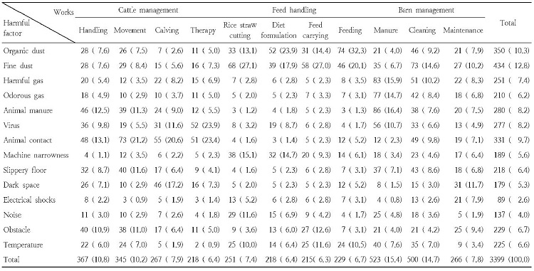 한우 사육 시에 주로 접하게 되는 유해ㆍ위험 요인으로 물리적 요인(온도, 조도, 소음), 화학적 요인(분진, 유해가스, 악취), 생물학적 요인(세균 및 바이러스, 가축분뇨), 인간공학적 요인(기계 협착, 전기감전, 장애물 충돌 및 낙상), 환경적 요인(미끄러운 바닥), 가축 요인(충돌ㆍ접촉) 등으로 분류하였고, 주요작업은 한우관리(다루기, 이동, 분만, 치료), 사료취급(볏짚절단, 사료배합, 사료운반, 사료급여), 농장관리(분뇨처리, 축사청소, 축사 시설정비)로 구분하였다. 한우 사육과 관련하여 사육자가 경험하고 있는 유해ㆍ위험 요소에 대한 조사결과는 Table 3과 같다. 한우 사육자가 경험을 통해 느끼는 유해ㆍ위험 요소는 미세먼지(12.8%), 유기(사료)분진(10.3%), 소와의 접촉(9.7%), 가축분뇨(8.2%), 세균 및 바이러스(8.1%), 유해가스(7.4%), 장애물 접촉(6.7%) 및 온도(6.6%) 등의 순으로 조사되었다. 주요 작업별로는 가축 분뇨처리(15.4%), 우사청소(14.7%), 소 다루기(10.8%) 및 이동작업(10.2%), 송아지 분만작업(7.9%), 우사 정비작업(7.8%), 볏짚절단 작업(7.4%) 등의 순위로 유해ㆍ위험이 있는 것으로 나타났다. 먼지(분진)의 경우 주로 사료취급 작업 및 청소작업 시에 발생하였는데 미세먼지의 경우 볏짚절단, 사료운반 및 사료급여 작업, 사료배합, 우사청소 시에 주로 발생하였고, 유기분진의 경우에는 사료급여 및 사료배합, 사료운반, 볏짚절단 등의 작업에서 많이 발생하는 것으로 조사되었다. 소와의 접촉 사고는 치료 , 이동, 송아지 분만, 소 다루기 등의 소와 직접 관련된 작업과 우사청소 시에 주로 경험하는 것으로 나타났다. 가축분뇨 등의 이물질 접촉 상황은 주로 분뇨처리 , 소 다루기 및 이동, 송아지 분만 시에 나타났고, 세균 및 바이러스 등은 치료 작업, 분뇨처리, 송아지 분만 작업 시에 등에서 나타났다. 그리고 장애물 접촉 및 충돌은 소 다루기거나 우사 내에 울타리(Fence) 이동 시에, 그리고 사료를 운반하는 과정에서 발생하였다. 계절적 요인인 고온 및 저온 등에 따른 온도의 경우는 주로 육체적 작업을 동반하는 사료취급 작업과 소 관리 작업에 영향을 주는 요인으로 조사되었다. 그 밖에 우사 청소 시에 미끄러운 바닥 환경, 여름철 악취 발생, 사료배합 및 농기계 사용 시에 협착 및 감김 등의 다양한 위험이 있는 것으로 조사되었다(Table 3).
