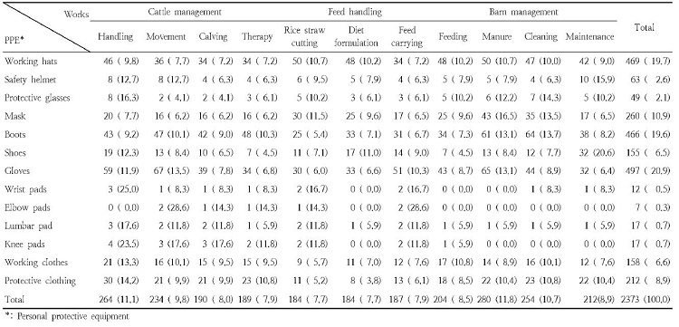 전체적으로 보호구 착용률 현황 조사결과 장갑(20.9%), 작업모(19.7%), 장화(19.6%), 마스크(10.9%), 방역복(8.9%), 전용 작업복(6.6%), 작업화(6.5%) 등의 순위의 착용률을 보였고, 그 밖의 보호구의 착용률은 5% 미만으로 매우 낮을 것으로 나타났다. 장갑의 경우 소 이동(13.5%), 분뇨처리(13.1%), 소 다루기(11.9%) 작업 시에 주로 착용하였고, 전반적 작업에서 대부분 장갑을 착용하는 것으로 조사되었다. 작업모의 경우에도 대부분의 작업에서 착용하고 있으며, 분진이 많이 발생하는 볏짚절단(10.7%) 및 사료배합(10.2%) 작업과 분뇨처리(10.7%) 및 청소작업(10.0%) 시에 착용률이 높았다. 장화의 경우에는 축사청소(13.7%), 분뇨처리(13.1%), 소 치료(10.3%) 작업 등의 가축의 우리 내부 작업 시에 이물질 방오를 위한 착용률이 높았고, 대부분의 작업에서 일상적으로 착용하는 것으로 조사되었다. 마스크 착용은 분뇨처리(16.5%), 분진이 많이 발생하는 축사청소(13.5%), 볏짚절단(11.5%), 사료배합(9.6%) 등 분진이 많이 발생하는 작업 시에 착용하는 것으로 조사되었다. 그리고 방역복은 방역 및 이물질 흡착 및 분진이 많은 환경에서 착용하였고, 작업복은 주요 작업 전반에 착용으로 나타났다. 그리고 주요작업에 따라 착용하는 주요 보호구 현황을 살펴보면 분뇨처리(11.8%), 소 다루기(11.1%), 축사청소(10.7%) 등의 작업에서 대부분의 보호구를 착용하였다. 분뇨처리 및 축사청소의 경우 장갑, 작업모, 장화, 마스크 등의 주요 보호구를 착용하고 있었고, 소 다루기 작업 시에는 장갑과 장화, 방역복 등의 보호구를 착용하는 것으로 나타났다. 그러나 전반적으로 안전화, 눈 보호구, 신체 접촉사고와 관련된 보호패드 등의 착용실태는 매우 낮은 것으로 평가 되었고, 소와의 접촉사고 예방을 위한 보호 장구는 없는 것으로 조사되었다(Table 5).